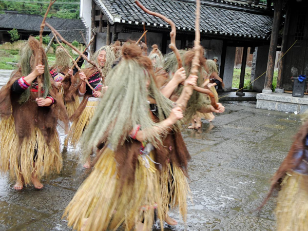 圖為湖南省花垣縣邊城鎮(zhèn)隘門村土家族毛古斯舞表演 老鐵供圖